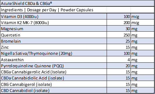 The AcuteShield CBDa & CBGa® “Patent Pending #17/815,878” proprietary formulation includes elements of a recommended advanced immune support optimization system that combines a custom blend of cannabinoids, vitamins, trace elements, multiple bioactive components, bioflavonoid polyphenols, proteolytic enzymes, and antioxidants that may work synergistically to achieve the result of optimizing your immune system.