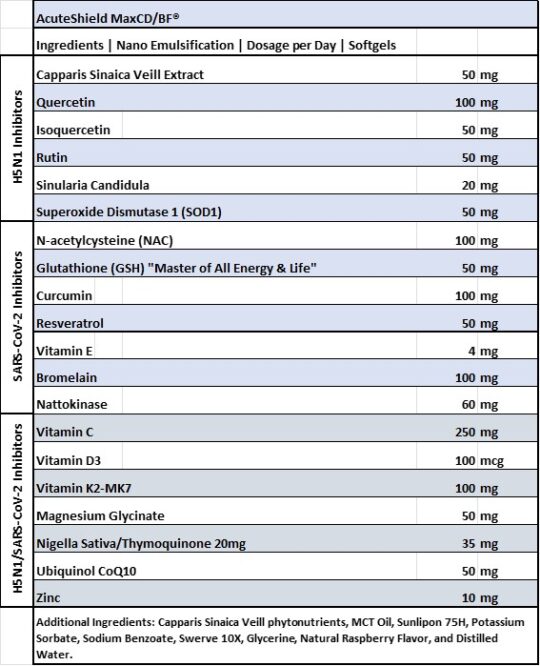 The “AcuteShield MaxCD/BF®” sublingual nano emulsion nutraceutical “BF” ingredients were specifically selected for the H5N1 (Bird Flu) virus and mRNA Bird Flu Vaccines.